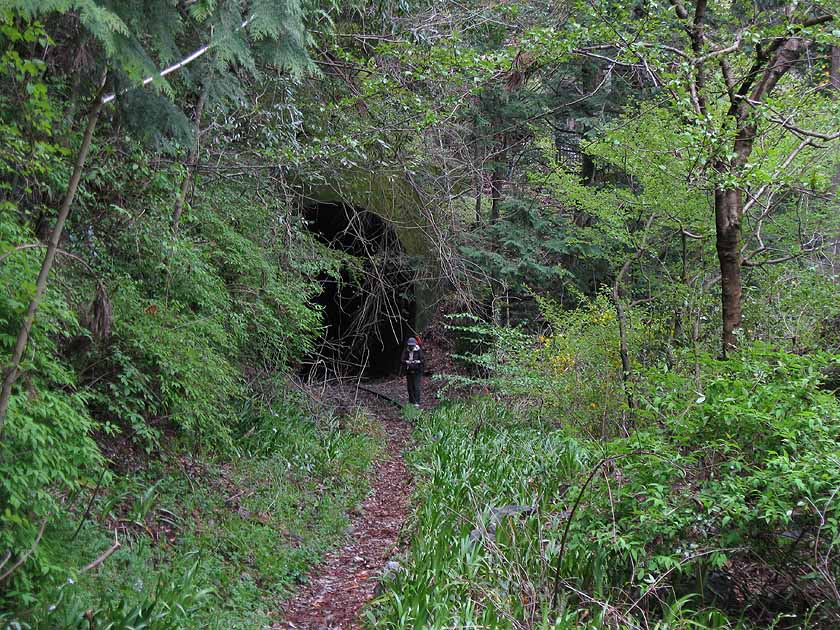 突如出現した古い鉄道軌道。この線路はその後もつかずはなれず私たちのまわりにありました。小河内ダム建設のための工事用鉄道であったといいます。