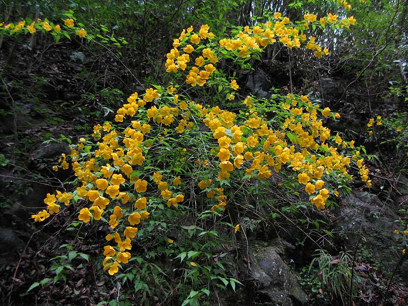 周囲の山肌には桜の薄いピンクのかたまりがたくさんありましたが、この日、私たちの目の前に現れた花の主役はヤマブキでした。これでもか、これでもかと登場しましたが、これなどは元気良く撮れた1枚。