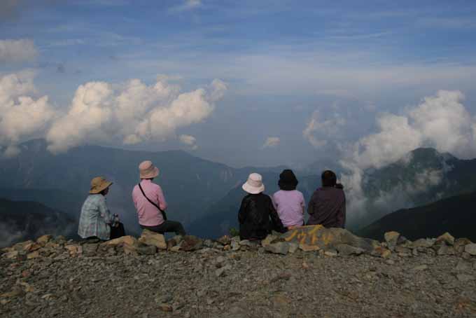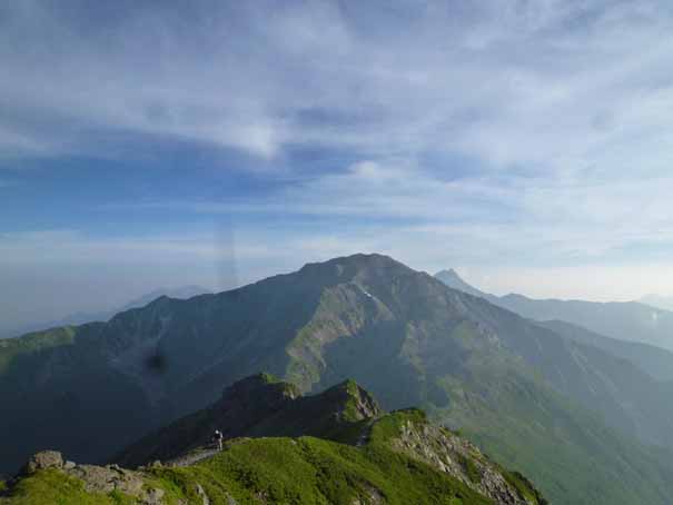 じつは「山4」と同じ場所から180度振り返ると、この風景。人が10人ほど立っているのが見えるのが今回5峰目の3,000m峰の農鳥岳山頂。