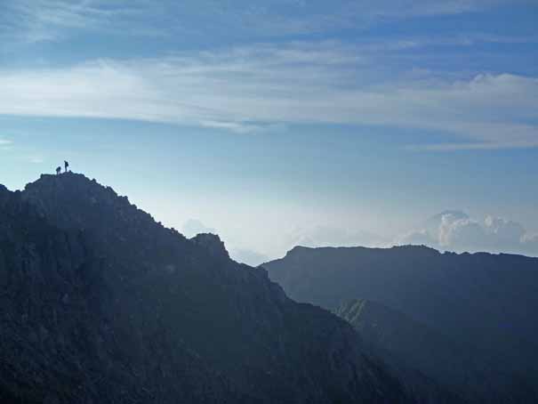 遠くに見えるシルエットの富士、横にたなびく雲が印象的。 山頂に立つ二人が写真を 引き締めている。