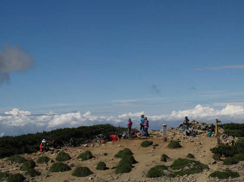 【03】広々とした三俣蓮華岳の頂上でゆっくり展望を楽しんだ。お二人の先、双六岳から延びる稜線の向こうに穂高連峰が見える。