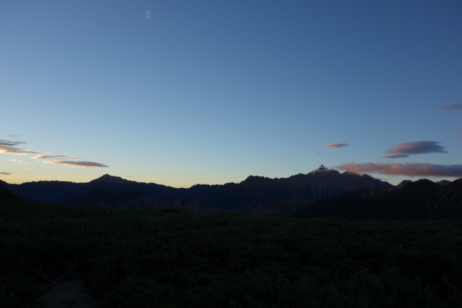 【13】槍から東に延びる稜線。だんだんと明るくなってくる。朝日にそまる雲もきれいだ。