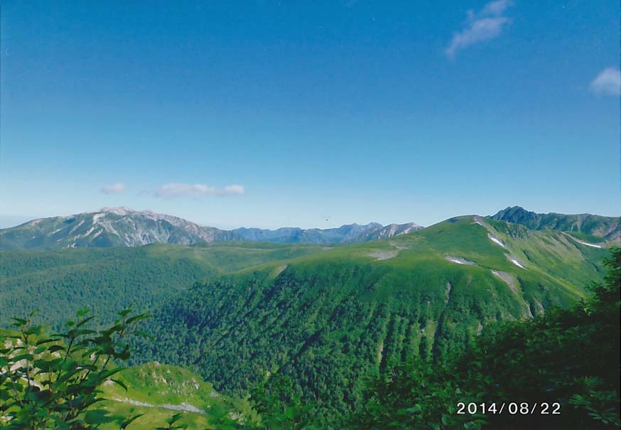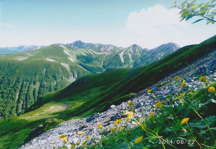 【22】最終日、雨上りの鏡平小屋を午前7時に出発して3時間、途中からは青空も出て北アルプスの眺めを楽しみながら、やっと長い下りも終わりに近づいています。北アルプスと別れるのは残念だけど、お風呂と食事は、もうすぐ。