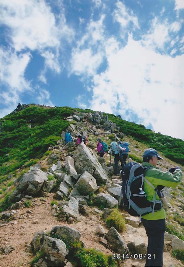 かなりな岩壁を、みんな黙々とよじ登っています。ちょっとした岩場の感じだけれど、水晶岳の最後の登り、こんなだったかなあ。