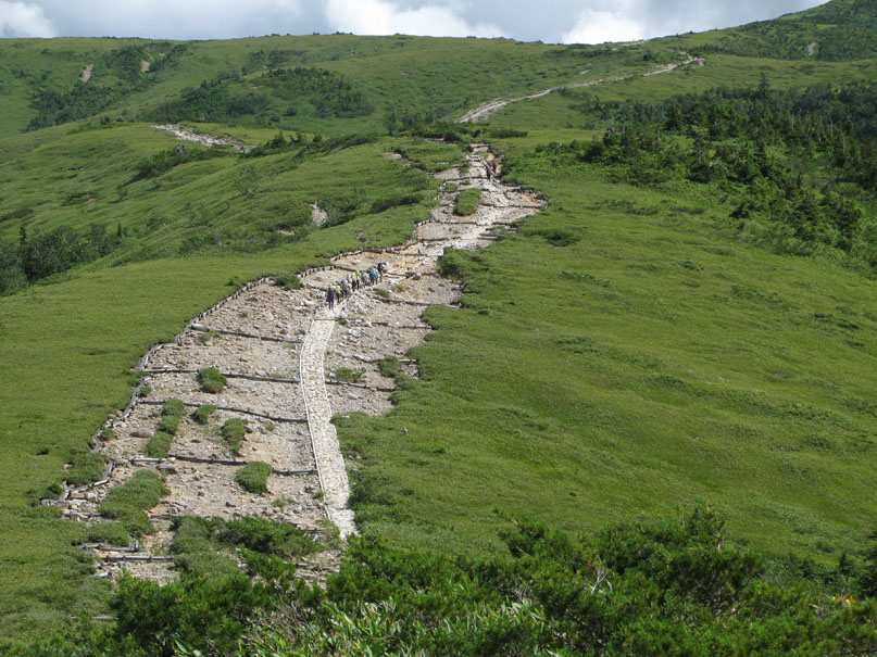そろそろ太郎平小屋が稜線上に姿を現そうというあたり。登山者による踏みつけ被害の拡大を食い止めるには成功したと考えられるが、復元へと向かいつつあるかどうかは不明。画面中央に登山者の列が見える。
