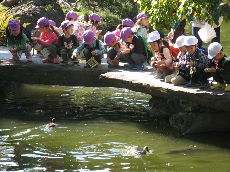 【02】私たちのすぐ前に入園した遠足の幼稚園児たち。お行儀よく橋の上に並んでいます。池の鯉を見ているのね。