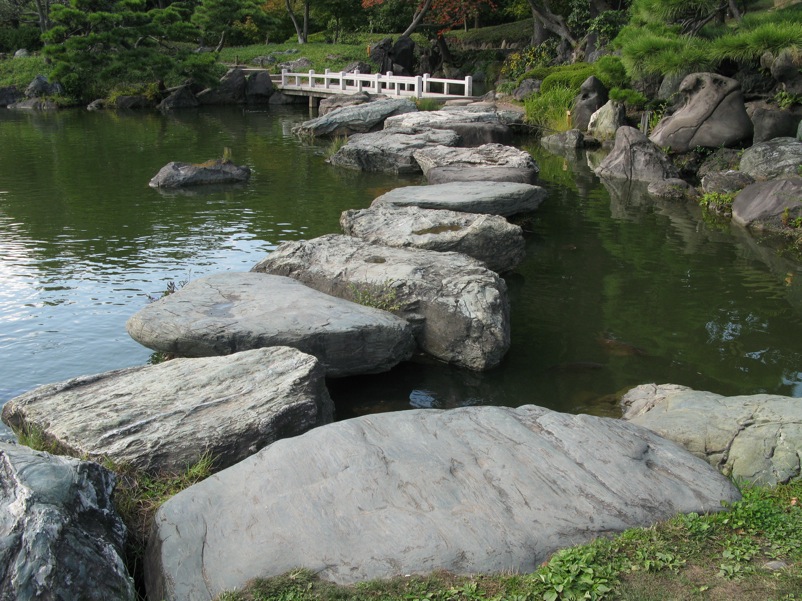 【06】この清澄庭園では、いろいろな所に、実にいろいろな石が使われている。その中でも特に気に入ったのが、この石囲い。灯篭の一部や、柱の一部が使われているみたい。それがなんとも言えずユニークで、なんといってもお洒落!装飾品としての命がまた吹き込まれ、人の目を楽しませ続けるこの石たち。私の目には、幸せそうに映りました。