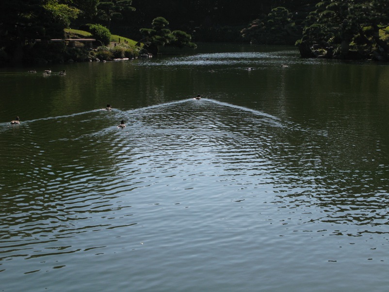 【46】水鳥達が池の中程にお行儀良く並んでいました。もう少し上の方に松の木を見せたほうがバランス的に良かったのかもしれません。