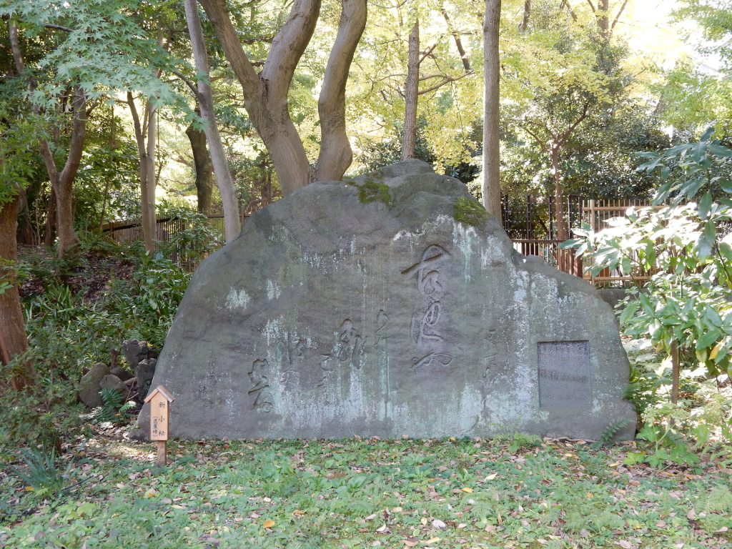 【82】芭蕉の「古池や」の名句が刻まれた石です。芭蕉の奥の細道行始発点がこの近所にあるとの事で、商魂たくましい庭園側が設置を考えたのでしょうか。後ろの大きな木に負けない位堂々とした石でした。