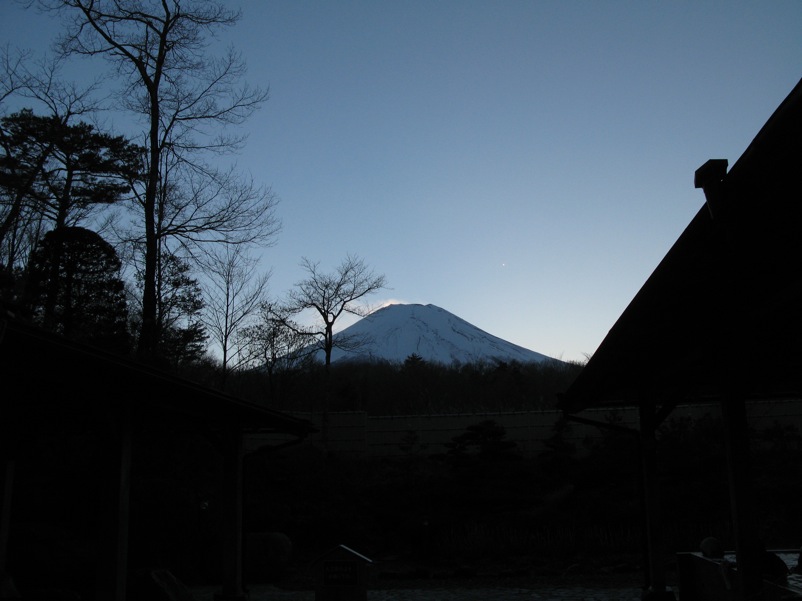 撮影時刻にご注目ください。手前が暗くてよくわかりませんが、紅富士の湯の露天風呂からの富士山です。つまり山中湖畔に着いてから紅富士の湯に来るまでの間に太陽は富士山に落ちたようです。湖畔ですこし待ってもよかったかな、と反省しました。(じつは湖岸のどこかでハクチョウたちが群れていると期待していたのです。そうだったら必然的に落日を見られたはずなのですが)