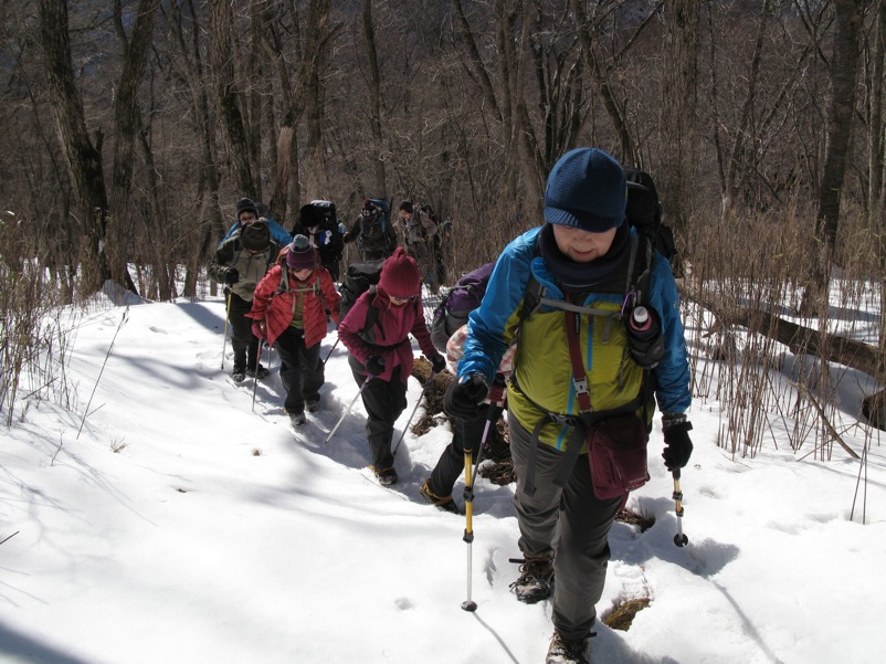 樹林帯に入ると、トレースがあるかないかで難易度がまったく違ってきます。なかったら、日没時刻を勘案しながら、別の道を探ることを第一に考えます。冬の山歩きの一番危険な状態です。でもここにはかなりしっかりしたトレースがあったので、トップ体験をいつものように10分交代にしてルートファインディングの体験をみなさんにしていただきました。