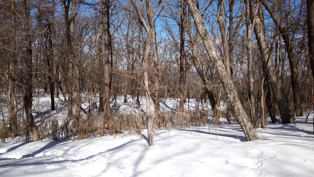 冬の低山の美しさです。この先に、一直線に足跡がのびていたので、キツネのようでした。