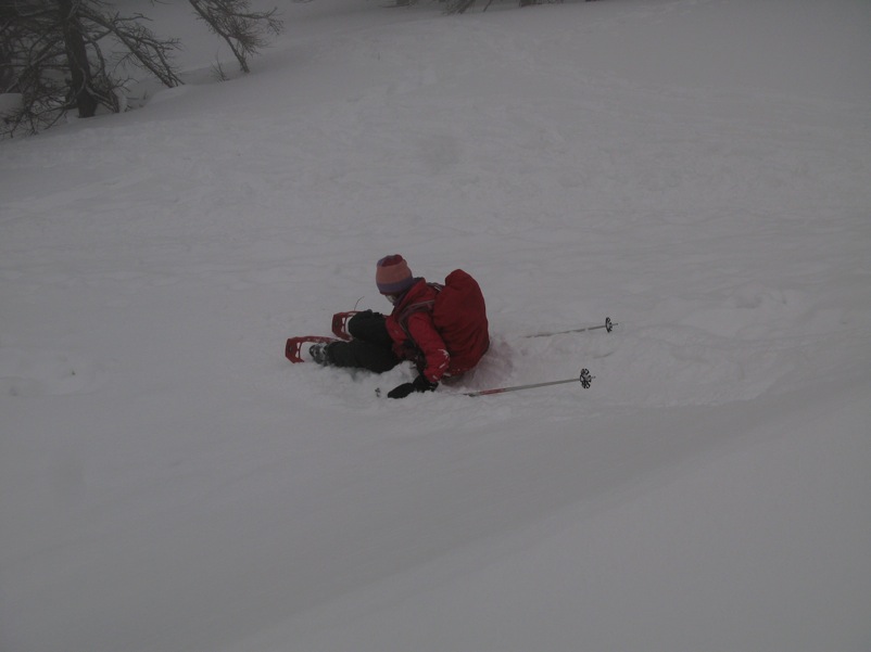高峰山まで行けるような時間がある場合には、わざわざ新雪の急斜面に踏み込んで何人かが転ぶようにします。危険のないところで一度転んでおくと、いろいろな意味で安全度が高くなります。これなどは吹きだまりの急斜面から、半分転落という状態です。