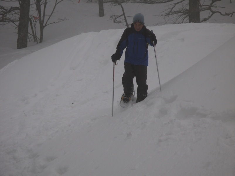 下り斜面で「走る」というのも道具にからだを慣らすのに貴重な下準備です。今回借りられたのはMSRの新型機種で、10年ほど前に多くの皆さんに買っていただいたスノーシューと(たぶん)同じ本体。画期的なゴムの締め具がすでにみな交換不可能な状態になっていて使用を諦めていたのですが、こんなのが登場したら締め具部分を交換できるのではないかと、今回の5人中3人が思ったのでした。