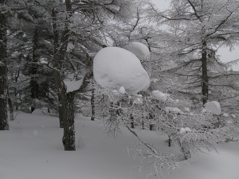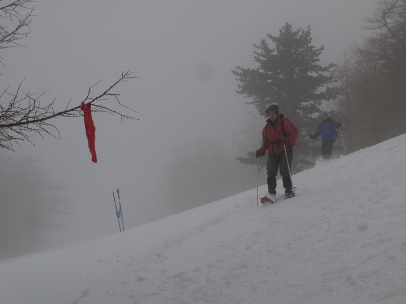 登山者がいるのはトーミの頭。じつはそこまでの登りの部分が裸の急斜面になっていて危険地帯。登りは緊張しただけですが、下りでは滑落の危険がなしとはいえません。クサリがついてはいるのですが、ほとんど雪に埋まっていて、事故対策にはなりません。私は登るときからその危険部分は林の中を突破すると決めていました。幸いここに見えるツアーグループはここで引き返すとしてやはり林内に踏み込んだので、その後を追わせてもらいました。