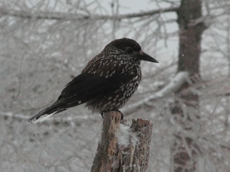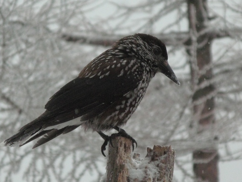 朝、というより宿の人の解説では午前中は、餌台はほとんどホシガラスが独占状態とか。夏にはほとんど近寄らないというホシガラスが10羽以上、食べ放題、遊び放題の天国状態が続きます。