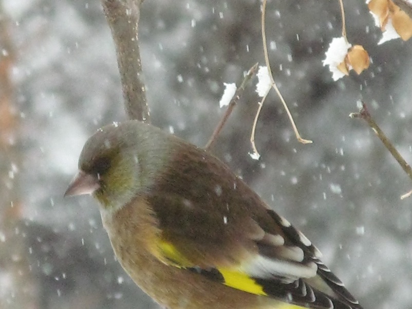 カワラヒワの表情がかなりこまかく写りました。穏やかな表情。黄色がじつにいいセンスで散りばめられています。カメラはシャッターボタンを押してからいつ写真を撮ってくれるのかわからないうえに、ズームレンズを超望遠にすると対象を画面真ん中に維持するだけで必死。こんなフレーミングになったのは、そういう意味では失敗ですが、雪が背景以上の役割を果たしてくれて、まるで意図して撮ったみたいにうまくいきました。