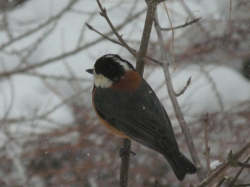 ヤマガラのポートレイト写真。目がきちんと見えないと野鳥の写真としては失格でしょうが、胸のふくらみがガラス越しに見ているとはいえ、雪の中でほっこりとしたいい気分に見えています。