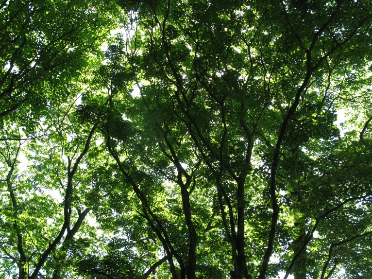 出発してすぐ、見晴台の入口にトイレがありました。じつは私は休憩時間中に走って済ませてきたのですが、みなさん恒例の連れションタイムになりました。暇をもてあました私は、新緑の緑を見上げるしかありません。