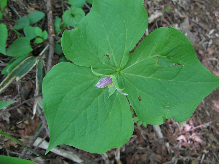 よく見ると、ふつうのエンレイソウならもっと茶系の色なのにものすごく美しい薄紫色です。ミヤマエンレイソウ(シロバナエンレイソウ)の若い時代をムラサキエンレイソウと特別に呼んでいるとか。それのような気がします。