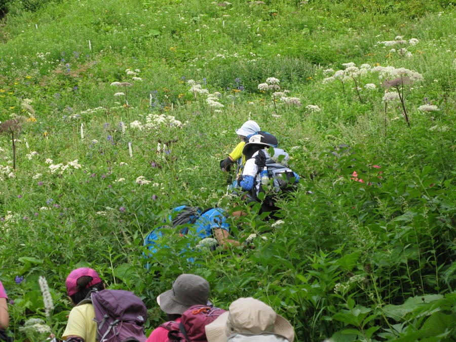 トリカブトが占拠する一郭がありました。はっきりとはわかりませんが、ミヤマトリカブトとしておくのが無難かと思われます。どこにでもあるという感じの上に、シカにの食害を逃れているので、山ではおなじみです。でも上の方からこんなふうに挨拶されると、ちょっとうれしい。