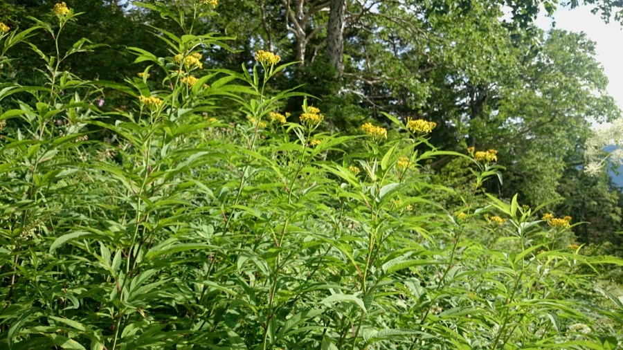 徳本小屋の前にはキオン(中央) とハンゴンソウ(右下) が並んで咲いていた。ちょっと見ただけではよく分からないけれど。