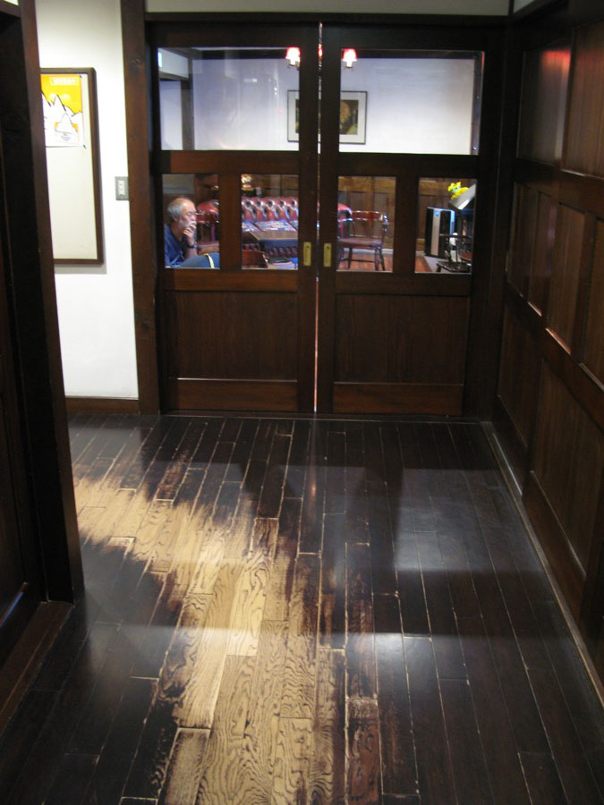 宿泊客の足で磨かれた廊下。浴室からフロントへ戻る道です。