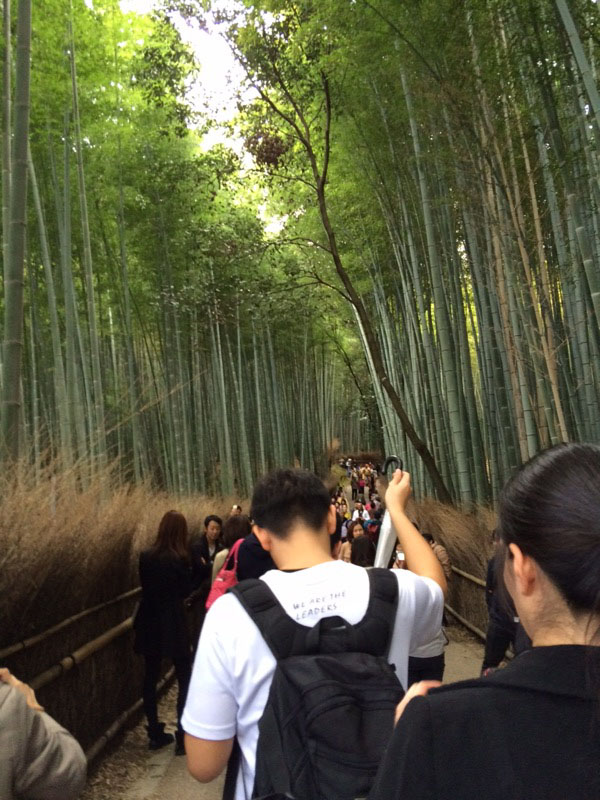 *紅葉のピークには京都市内はタクシーでも時間が読めないほどの渋滞になり、有名な寺社では門前での長時間待ちも覚悟しなければならないといわれます。それを覚悟で、メニューだけ豪華な計画を立てました。ついでに直径30cmほどの輪をひもで作って、全員のザックの背中につけました(実際にはほとんど必要がありませんでしたが)。その一日に私たち8人が見たもの、体験したものをレポートします。