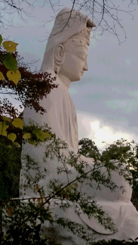 高台寺に隣接する高さ24mの霊山観音(りょうぜんかんのん)座像。竹林のところでその横顔が見えました。第二次世界大戦における全世界の戦没者を慰霊するため1955年に建立されたとか。ネットで見ると納骨施設のようです。