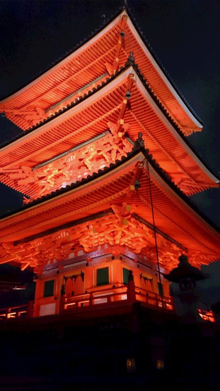 ライトアップされた清水寺の三重塔。朱色の塔は 昼間みるより 印象的だった。ここまで見られるなんて 流石 弾丸ツアー。