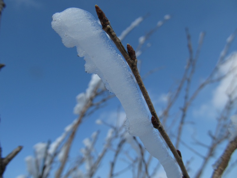 霧氷は風上に延びていきます。その最初の部分、裸の枝にぶつかって、その衝撃で瞬間的に氷になったところが透明感のある氷になっています。太陽に照らされると、全体がゆるんでくるのでしょうか、枝先のひとかたまりの氷片がドサンと落ちます。