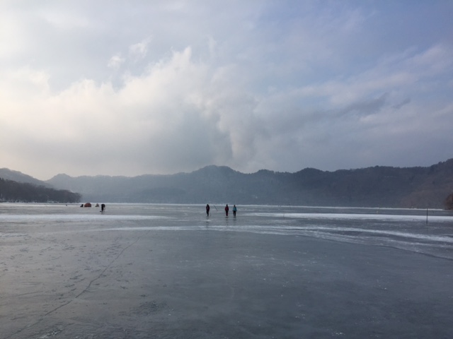 *かつて私の会にいた長野県出身者や北関東出身者は、スキーに縁のない青春時代を送っていたようです。戦後、スキー場にいるのは都会の若者で、土地の若者はスケートという時代だったのです。その後、全面凍結する湖がどんどん減りましたが、赤城山では生活排水の問題も少ないのでしょう。「全面結氷」が現在まで続いています。ワカサギ釣りがあるので冬も路線バスが走っています。いまや真冬の遊び場としてはものすごく贅沢なものとなりつつあるのではないかと思うのです。