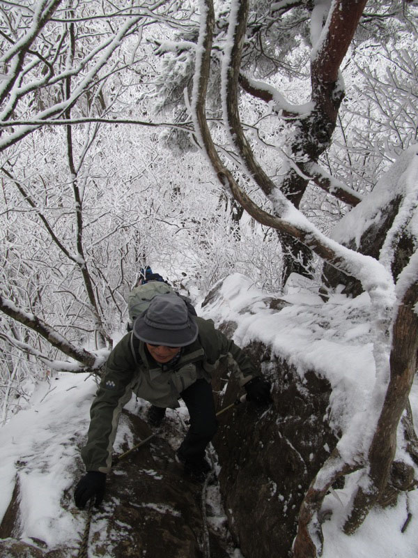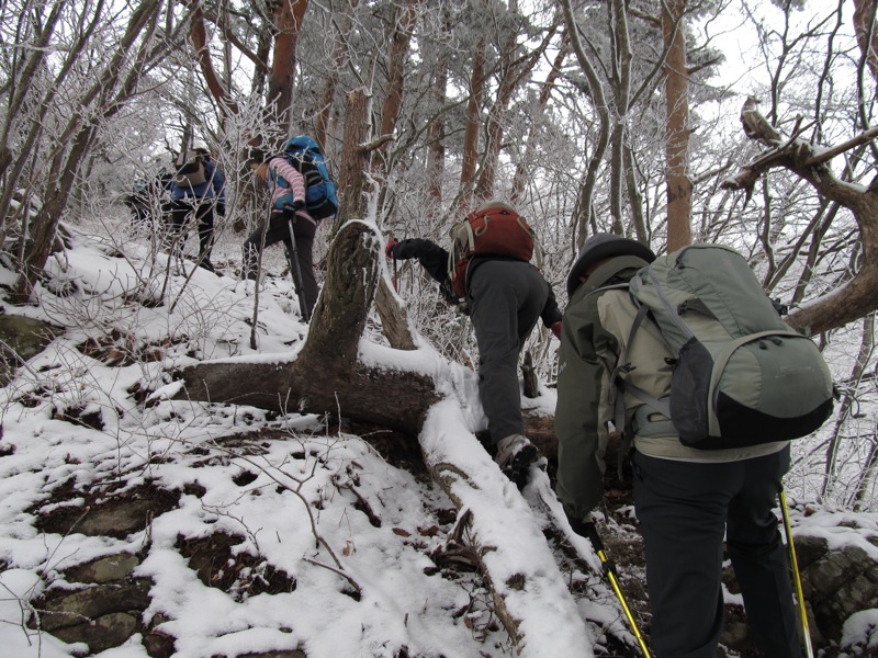 大棚から見上げると、高川山の斜面が霧氷にしては厚みのある白化粧になっていました。雪が降ったのかもしれないという感じです。あわてて軽アイゼンを持っている人、持っていない人をチェックしたら、どんな状況でもなんとかなりそうな計算が立ちました。装備状況によってはクサリ場のあるシラノサワ・コースを敬遠しなければ、と考えました。