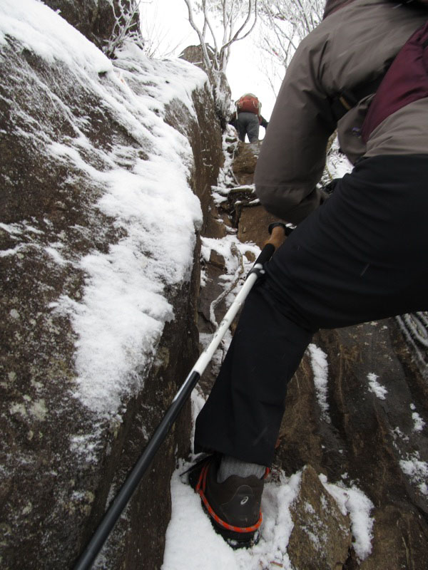 雪は山頂に向かって、しだいに深く積もっている気配です。リーダーにとってはこのあたりが一番の悩みどころです。どこかで、進退の決断を求められるかもしれない、ということを考え始めます。
