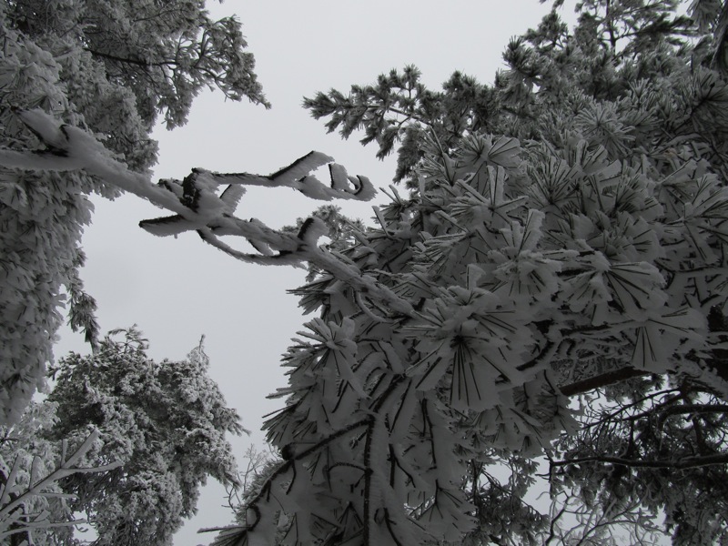 ふたたび雪に目が向きました。霧氷は風上に向かって伸びていきますが、雪は上から降り積もります。そのふたつが奇跡の合体をするのが蔵王や八甲田山の樹氷ですが、ここではそれが別々のものとして並んでいます。