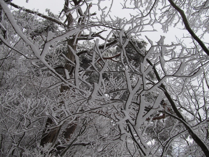 足元の雪はまだ歩くのに支障がありません。でも岩場ではどんな状態になっているでしょうか。ふと気づくと、細い木の枝に雪とは違う白い模様が浮き出てきました。
