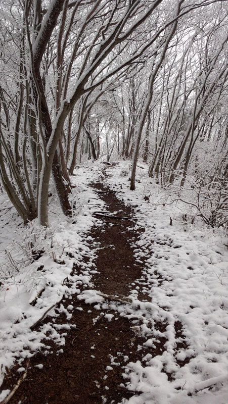 景色は雪でも、道はまだいつものまま。首都圏では年末からしばしば霧氷を見ますし、3月になると西高東低の気圧配置が崩れて大雪が降ることもあります。しかし雪と霧氷がダブルで、しかもフレッシュな状態で見られるというのはほんとうにラッキーでした。