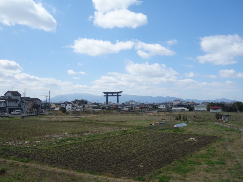 車窓ののどかな田園風景の真ん中に突然大きな鳥居、さすが奈良。