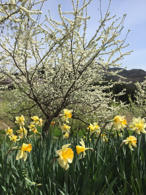 スイセンの花が向いているのはおおよそ南〜西だと思うのですが、ここでは背後、上から陽光を浴びています。エッ? なんでアッチを向いているのだろうと思って撮った記憶があります。