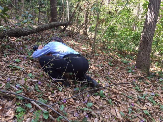 アケビ(木通)です。この写真では分かりませんが、同じ株に雄花と雌花が付いてます。3枚の花弁のようなガクの中に雌蕊が6−9本バナナの房のようについているのが雌花、ゲンコツを握ったような形に6本の雄蕊が塊になっているのが雄花。どこにでもある蔓性の落葉低木で、このアケビの花はフレッシュで色が鮮やかなので目に留まりましたが、地味な色なので見過ごされがちです。実は食べられるようです。