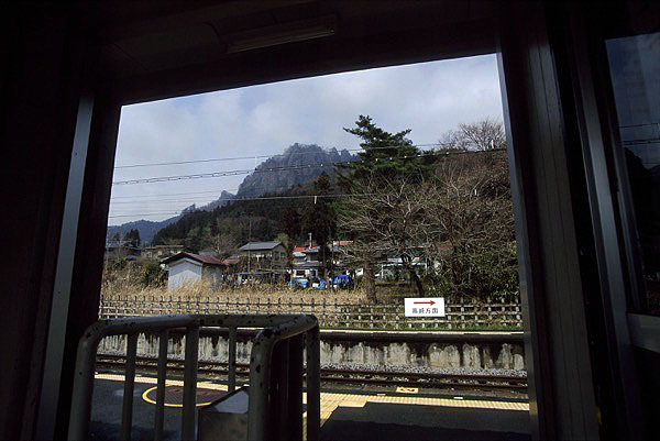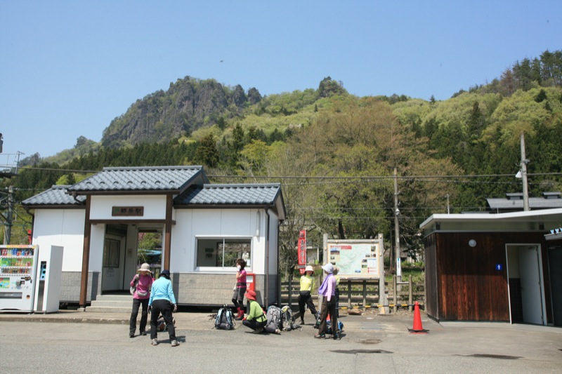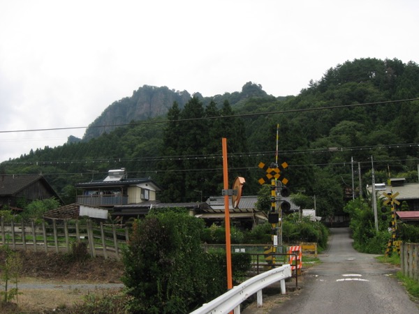 JR吾妻線・郷原駅。背後に見える岩峰のうち、大きなかたまりのてっぺんが岩櫃山の山頂です。
