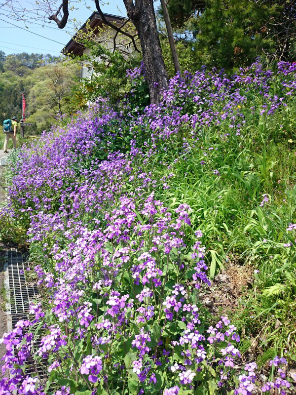 八重桜のトンネルを抜け登山口へ。足元にはハナダイコン。