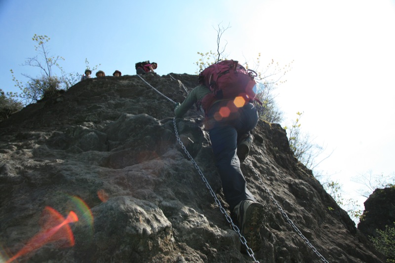 *じつは岩櫃山には危険度の高い岩場が何か所かあって、クサリ場となっています。そのクサリが、かなり力量のある人によって設置されたと感じるほど、適切なのです。岩場の歩き方を知って利用すれば、ものすごく安全な山だと感じます。ですから私は比較的初歩の人たちに岩場の歩き方を体験してもらうためにこの山を選んできました。スリルがあるけれど危険は少ないという点で秀逸でした。