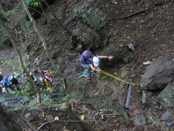 クサリ場通過の体験として、(1)クサリに頼らずに「三点支持」で登る。(2)ハンドホールドがとれなければ、クサリを支点として利用する。(3)パニックになったらクサリの要所に用意したロープの輪を握ることで、指示を待つ。……という仕掛けをしました。
