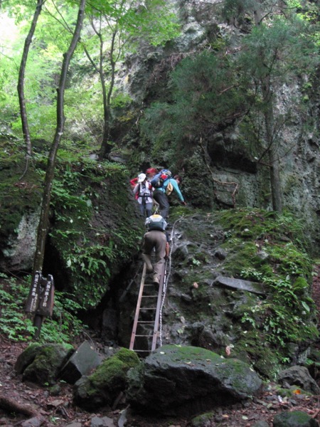 *こういうクサリ場は日本の山にはほとんど無数に存在します。ではどうするのか? というと、安全を確保するためにはハシゴにしてしまいます。槍ヶ岳の表銀座ルートは、ハシゴによって一般ルートになっています。岩櫃山は現在あるクサリによって一般ルートになっているのですが、これを「観光ルート」にするならハシゴをかけるしかありません。はっきり言って、岩場の歩き方の「三点支持」を知らずにクサリ場に突入すると、いつ、なにが、起こるかわかりません。そういうスリルを満喫できる山として今のまま残すなら、あくまでも登山ルートに。観光客は排除しなければいけません。