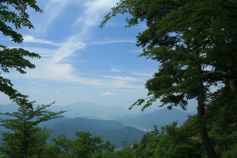 百蔵山から扇山を目指して 少し行くと 予想してなかった富士山が 霞みの向こうで顔を出していました。思いがけない出現に思わずシャッターを切りました。