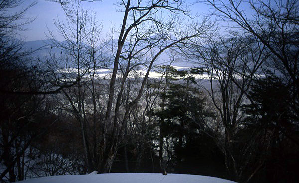 初めて中禅寺湖の湖面がくっきりと見えました。じつは中善寺湖畔の道をバスで来る途中、対岸の山肌に白いかたまりがひとつも見えませんでした。それがシロヤシオですから、バスの中では絶望的な気分になっていたのです。湖面の向こうに、その斜面が見えています。黒檜岳から社山をて半月山にいたる稜線で、そこでは鹿の群れによって刈り込まれたササ原と点在するシロヤシオが独特の風景を見せてくれます。