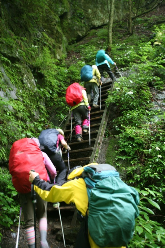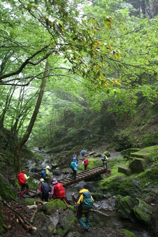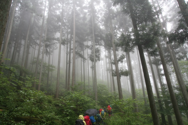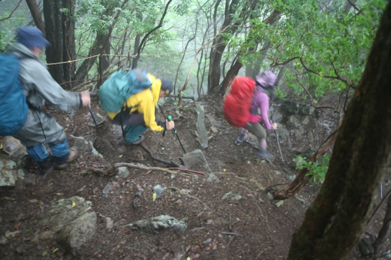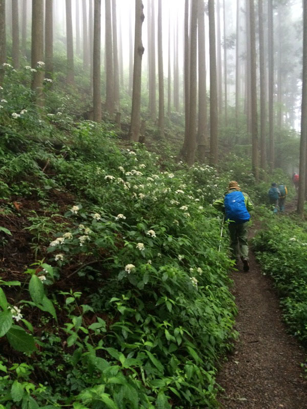 *この日の天気予報は最悪でした。雨に遭わない可能性は0%、つまり梅雨時に、雨具をつけたら外から濡れなくても内側からビッショリという最悪の状況が保証済みでした。私自身も家を出るとき憂鬱でしたから、参加者の皆さんはさぞや……と思っていたら、欠席はひとりも無し。最近、そういうことがしばしばあるので感心します。月に1〜2回の山歩きがその月の「健康」にかかわる重要性が、雨に遭う、遭わないよりも重要だとみなさん考えているのです。