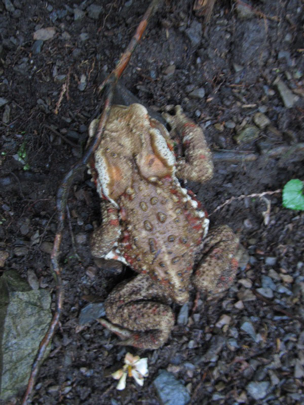 これはニホンヒキガエルと列島を二分しているアズマヒキガエル。ガマガエル、イボガエル、もちろん四六のガマなど、すべてこれの異名とか。短期間のオタマジャクシ時代以外は水が無くても生活できるそうで、10歳になる長寿ガエルもいるとか。ほかのカエルのように慌てて逃げないのは、外的から身を守る毒液を耳腺や皮膚、イボから出すことができるので鷹揚に構えているとか。