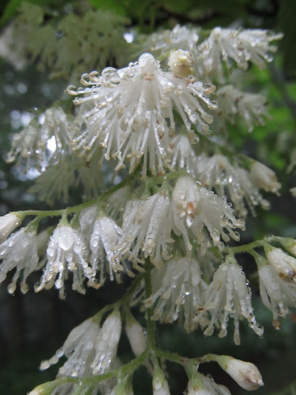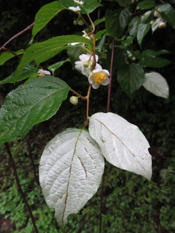 マタタビ(木天蓼、マタタビ科)の花。最近、なぜかマタタビをよく見かけるが、花を見たのは初めて。猫にマタタビというがマタタビには独特の臭気があるらしい。今度嗅いでみようかと思う。